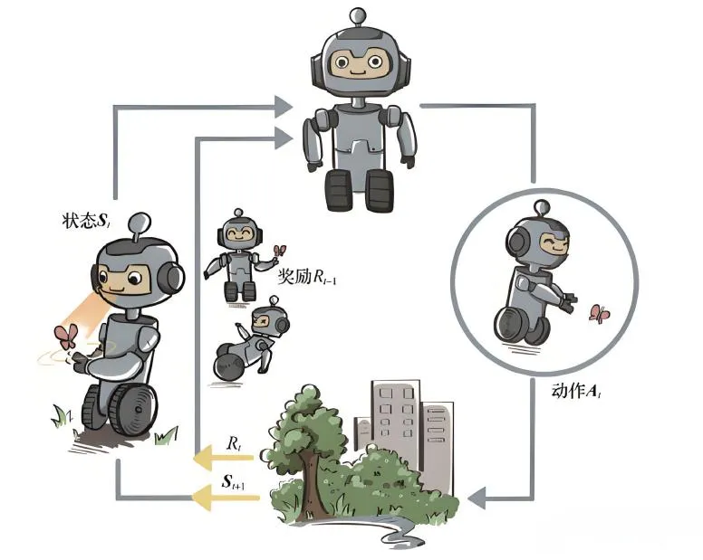 行为主义认为智能是通过智能体在环境中采取行动并接收反馈、逐步学习而形成的。他们关注的是智能体在环境中的行为表现,强调智能体与环境的交互。这是一种“做中学”的智慧:既然人类的学习是从每一次尝试开始的,那么人工智能的行为模式和策略也可以在与世界的真实互动中逐步形成。想象一下,行为主义者设计的智能机器就像是一只在林间自由探索的小动物,通过不断地尝试和试错,学会适应环境,找到食物,躲避危险。