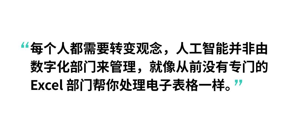 "每个人都需要转变观念,人工智能并非由数字化部门来管理,就像二十年前没有一个专门的Excel 部门帮你处理电子表格一样,这是我们每个人都需要拥抱的事情。"Kilshaw表示。