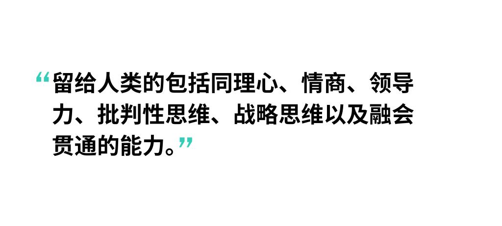诚然,人类与人工智能力量和工作转移是一种“单向接力棒传递给机器,因为它不会在某个时刻还给你”时,但Kilshaw也警告不要在知识领域过度专业化。“人工智能首先瞄准知识密集型领域——如医学诊断和宪法法律。留给人类的包括同理心、情商、领导力、批判性思维、战略思维以及融会贯通的能力,这些技能比领域特定的专业知识更易迁移和转化,它将在未来推动更多跨行业流动,而不是更少。”