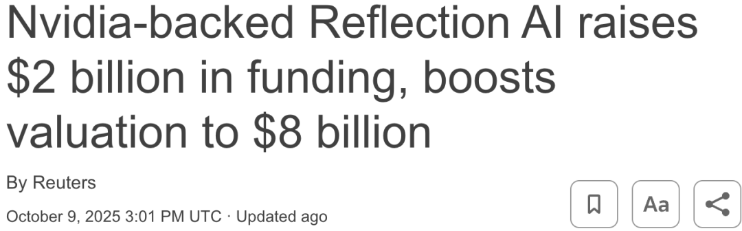 这也正是为何在今年3月刚完成1.3亿美元融资仅七个月后,Reflection AI又火速完成了一轮高达20亿美元的新融资。