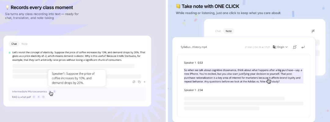 AskSia第一代产品聚焦在拍照答疑,而今,AskSia有诸多课堂学习辅助功能。例如,课堂实时AI问答,可以实现基于课堂录音内容的在线AI问答,就像有一个随时陪伴学生上课并解答课堂内容的助手。
