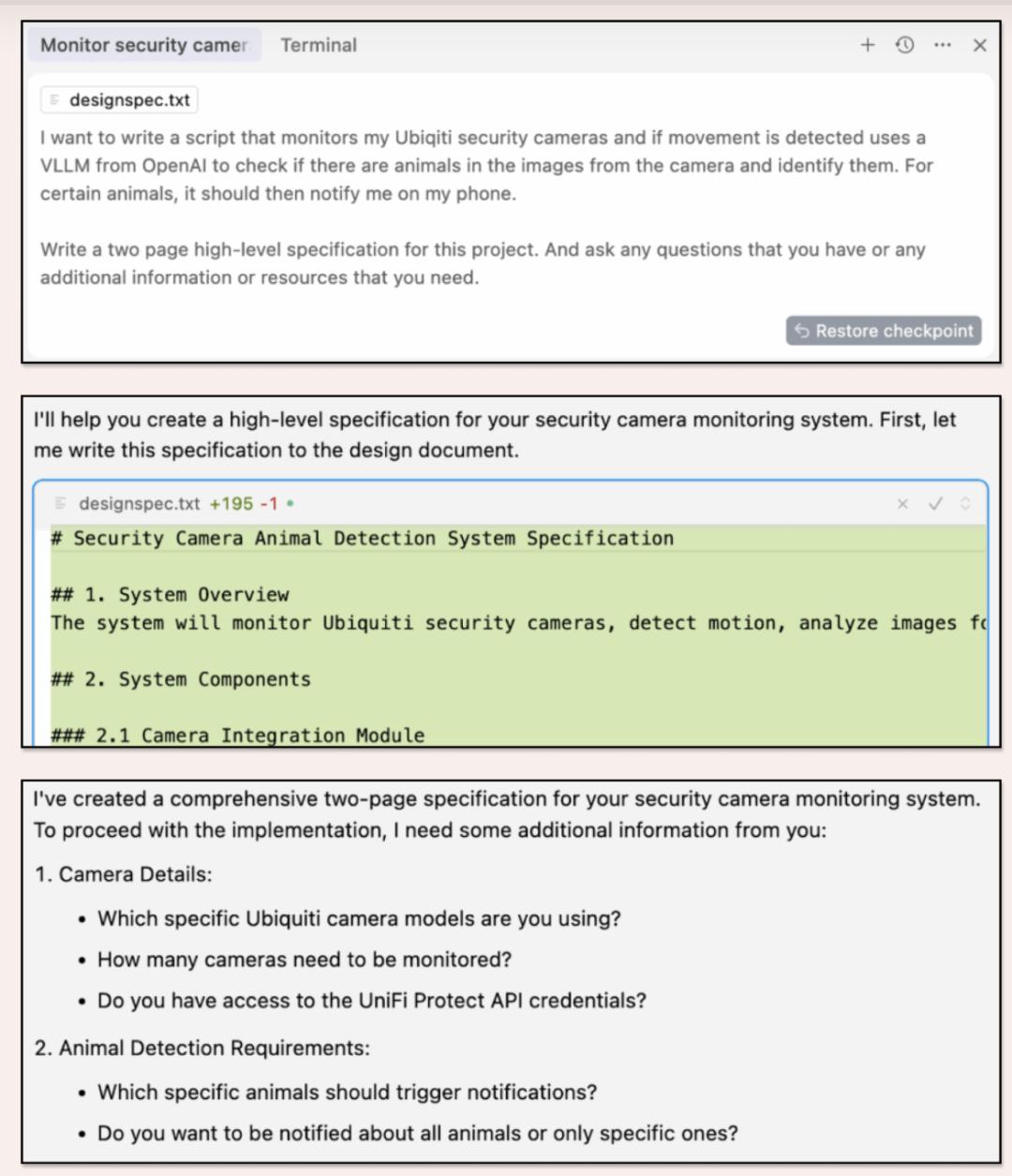 先规划:AI 负责帮你起草一个详细的功能描述,并主动提出它需要哪些信息,比如 API 密钥、访问权限、系统依赖。