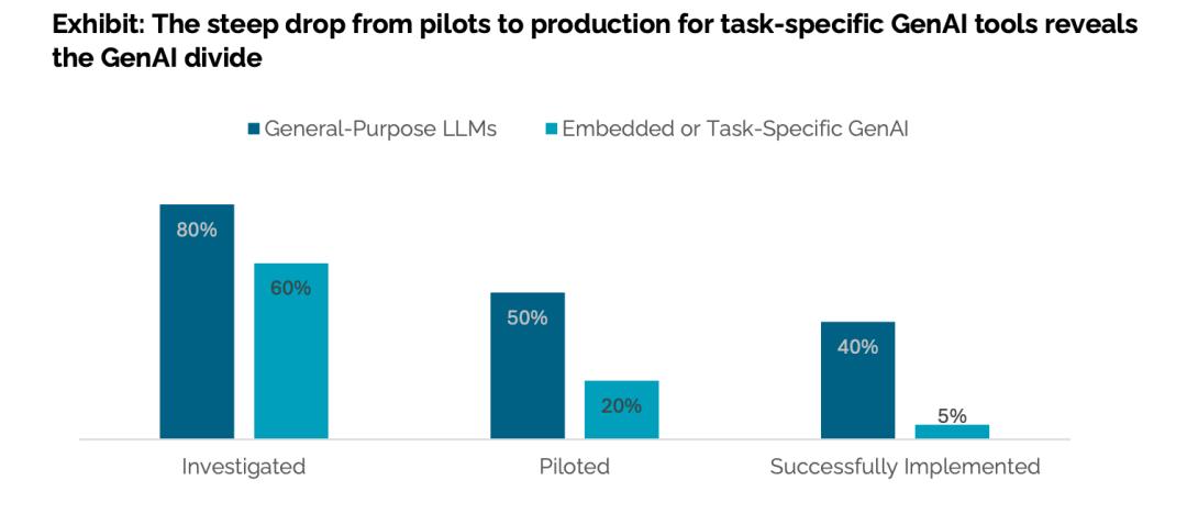 其次在“通用”与“专用”的选择上,MIT的数据同样反直觉。报告显示,在调研初期,有60%的企业考虑采用特定任务型GenAI。然而,从试点到成功实施,这个比例骤降至仅剩5%。与之相比,通用大语言模型的表现则稳健得多。