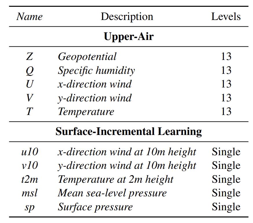 * 地面变量:含 2 米气温 T2M、10 米东风速 U10、10 米南风速 V10、平均海平面气压 MSL、地面气压 SP 等,作为增量变量,在模型第二阶段(增量训练阶段)引入,模拟实际观测中变量动态扩充的场景。