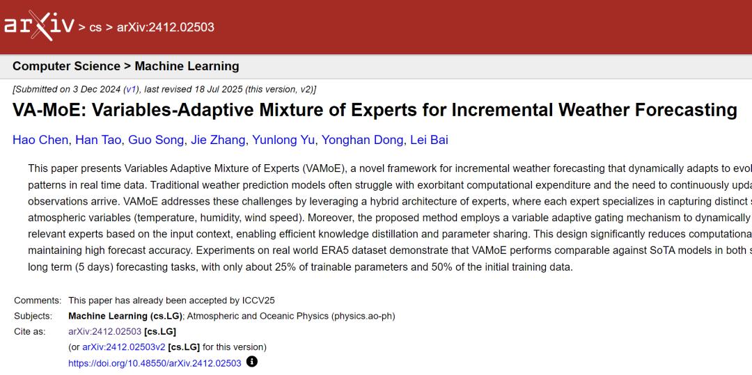 相关研究成果以「VA-MoE: Variables-Adaptive Mixture of Experts for Incremental Weather Forecasting」为题,已被计算机视觉领域国际顶会 ICCV25 接收。
