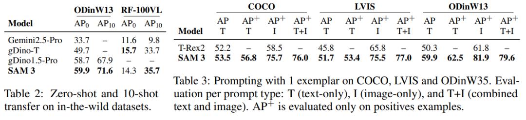 带有 1 个样本的 PCS。表 3 显示在三种设置下,SAM 3 在 COCO (+17.2)、LVIS (+9.7) 和 ODinW (+20.1) 上的表现均远超之前最先进的 T-Rex2。