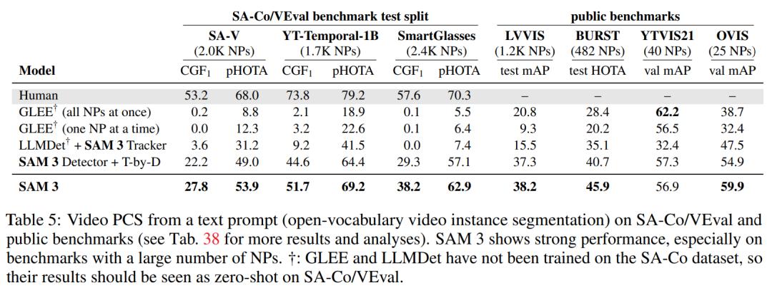 SAM 3 在文本提示下的视频分割表现。结果显示 SAM 3 的表现远超基线,尤其是在包含大量名词短语的基准测试中。