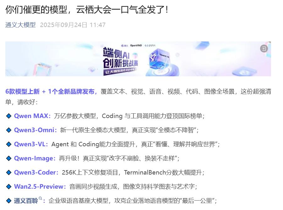 拉满,不是单纯将参数堆到天花板,而是将模态、场景和应用尽可能覆盖;干货,也不是象征性地开放几个版本,而是摆出一整套可落地的模型能力组合。这样的开源,不是让开发者挑不出缺口,而是要让上下游产业明确感受到,这是一种确定性的开源,不仅能用,还好用。
