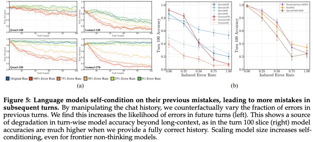 模型会基于其过去的错误自条件化:看到前几轮的错误之后,它更可能在后续轮中犯错。