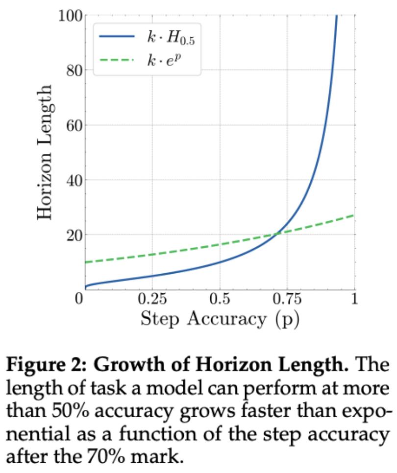 研究人员发现,单步准确率的小幅提升,会复利式地放大你能完成的总步骤数,使任务「里程」指数级变长。