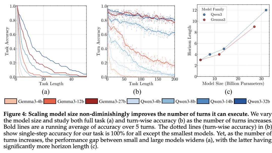 然而,随着轮次数增加,小模型与大模型的性能差距拉大(a),后者拥有显著更长的视界长度(c)。