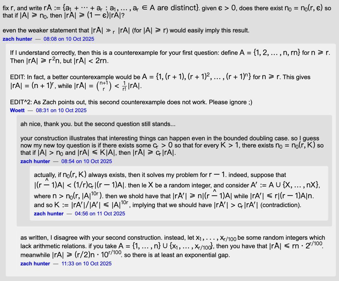 zach Hunter试图探索加法基在不同规模下的密度稳定性,Woett则提出了一些具体的集合构造,尝试作为可能否定命题的反例。双方围绕“互不相同元素(distinct)”“下密度(lower density)”以及“有界倍增(bounded doubling)”等概念展开推敲。