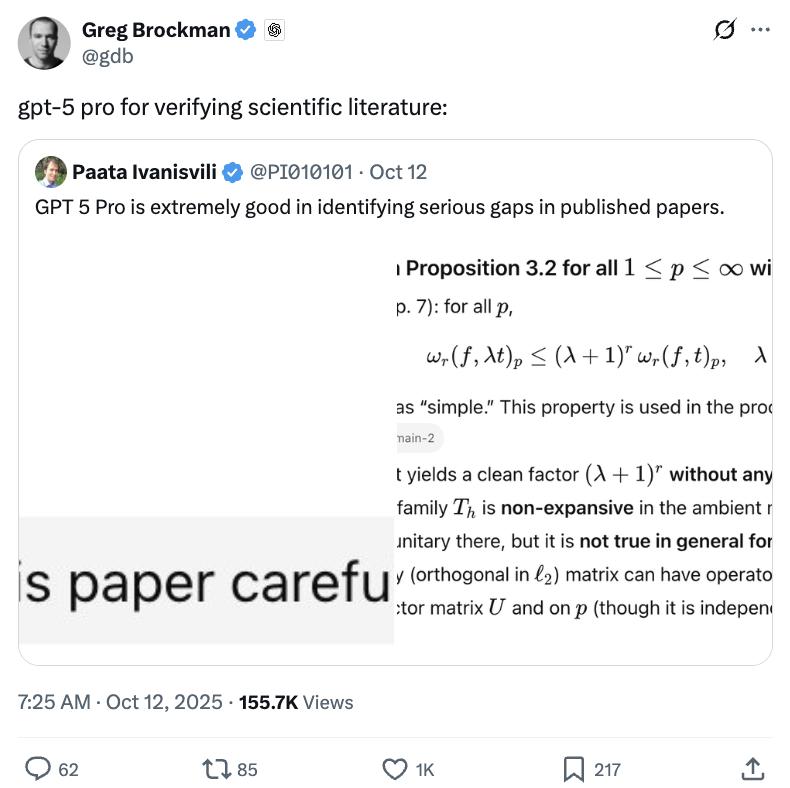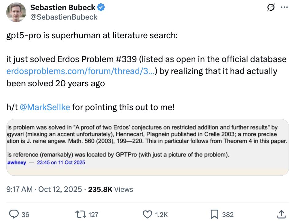 [1]https://x.com/SebastienBubeck/status/1977181716457701775[2]https://x.com/gdb/status/1977153596811804890