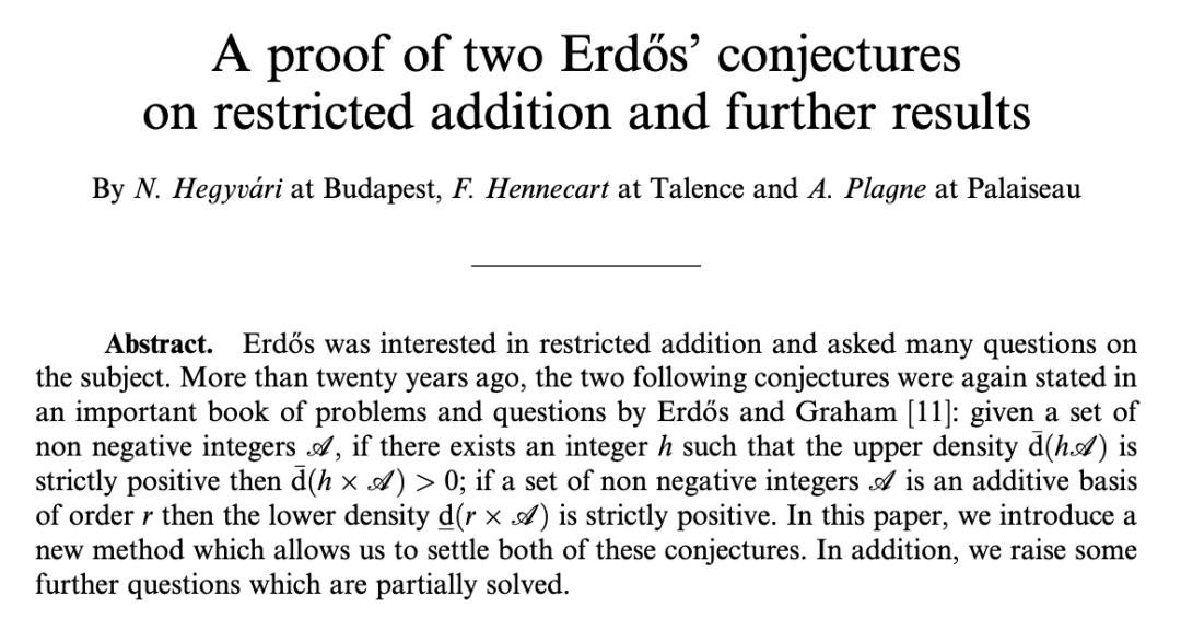 核心依据是Hegyvari、Hennecart、Plagne发表于《J. reine angew. Math.》(即《Crelle》)第560卷、页199-220的论文《A proof of two Erdos’ conjectures on restricted addition and further results》。