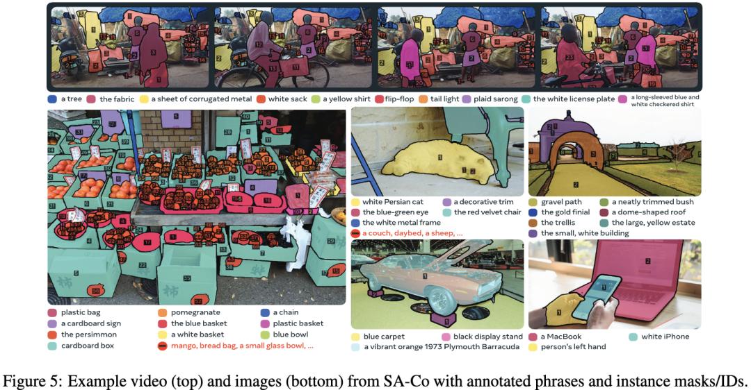 研究团队构建了一个包含400万唯一短语与5200万掩码的高质量训练数据集,以及一个包含3800万短语与14亿掩码的合成数据集,还推出了一个新的测试标准SA-Co基准。