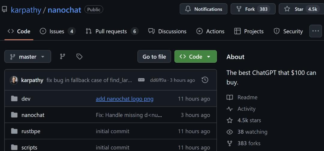 这个名为 nanochat 的项目据说可以教你从零开始,以 100 美元的成本自建 ChatGPT。它覆盖 LLM 的训练和推理,只要跟着学就可以了解构建大模型的所有步骤了。
