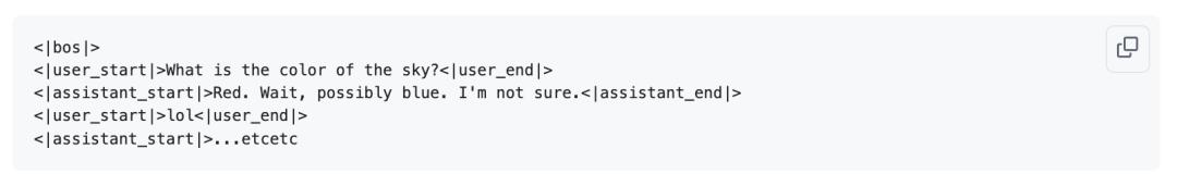 模型学习与多轮对话相关的特殊token (除了用于分隔文档的<|bos|>token,基础模型预训练期间没有这些token) 。
