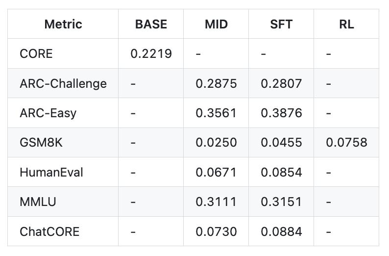 最后卡帕西指出的是项目文件夹里出现的report.md文件。它包含了很多与运行相关的细节,最后还有一个不错的总结表格: