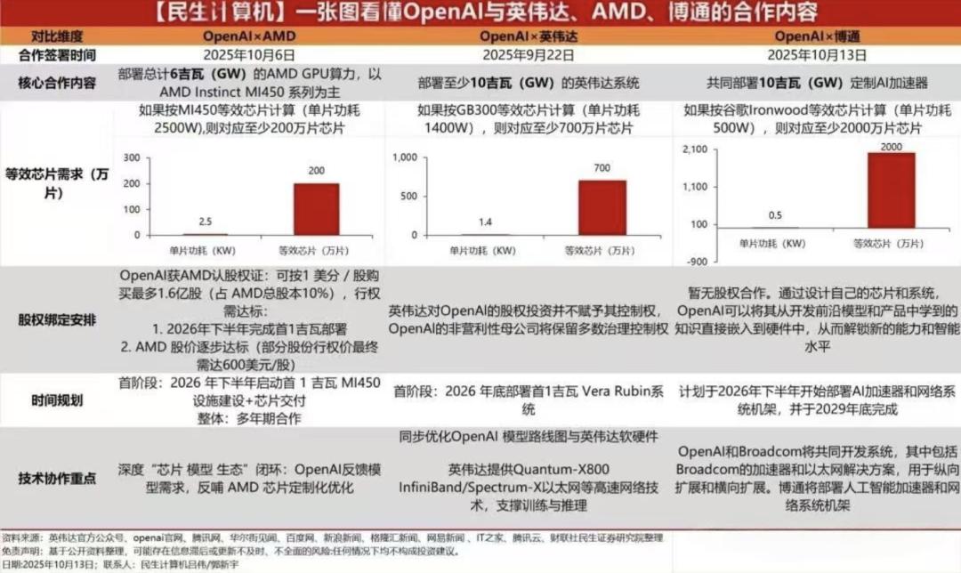 例如OpenAI、英伟达、Oracle之间,OpenAI提供AI、英伟达提供算力基础、Oracle提供数据,三者形成了一个比较完善的生态。参考OpenAI跟英伟达、AMD、博通的合作,那就是英伟达提供成熟GPU、AMD提供补充GPU算力、博通提供定制AI芯片及相关网络设施配套。