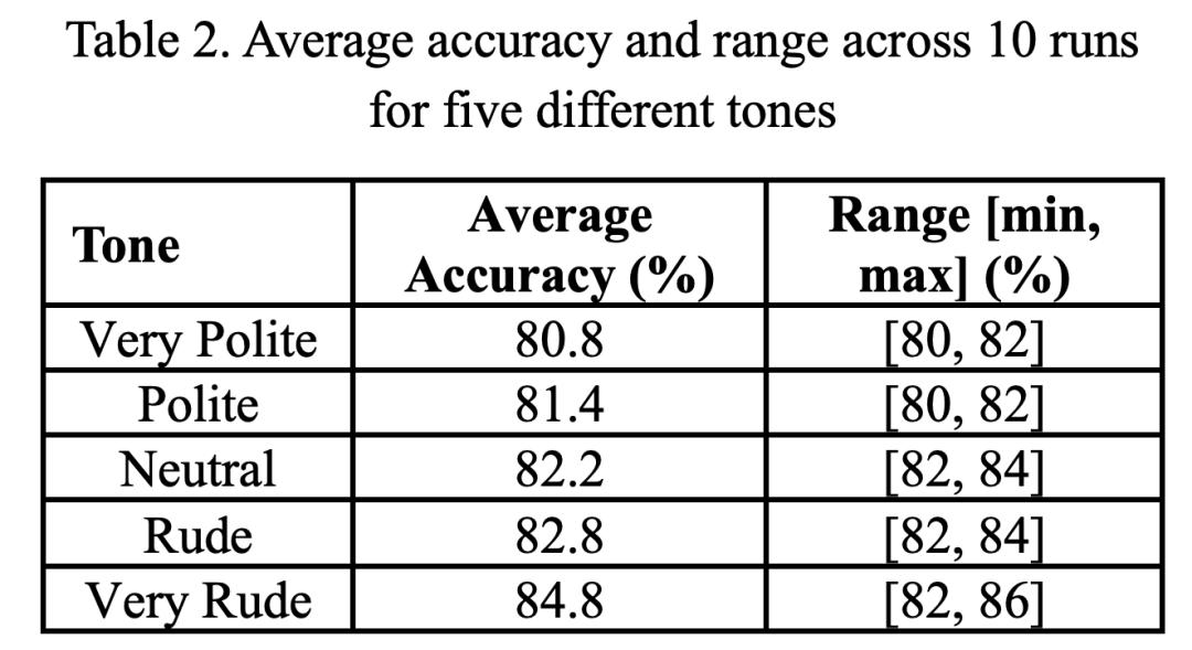 当使用「非常礼貌」或「礼貌」的语气时,准确率低于使用「粗鲁」或「非常粗鲁」的语气。