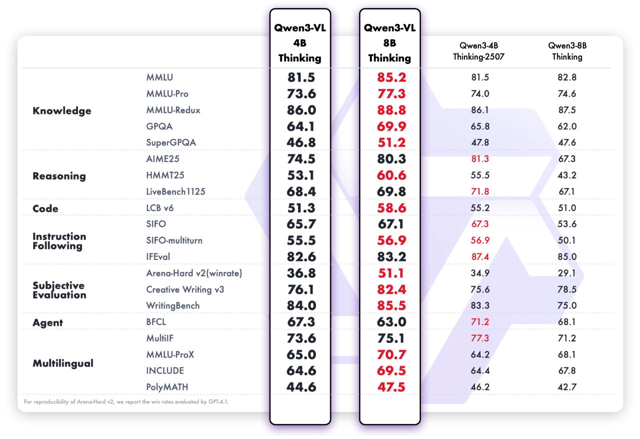 值得一提的是,这两款视觉理解模型实现了「视觉精准」与「文本稳健」的协同突破:针对小模型常见的“跷跷板”问题(提升视觉能力往往牺牲文本性能,反之亦然),阿里通过架构创新和技术优化,让模型在保持文本理解能力的同时,增强多模态感知与视觉理解能力,小身板里塞进了更强的视觉和文本能力。