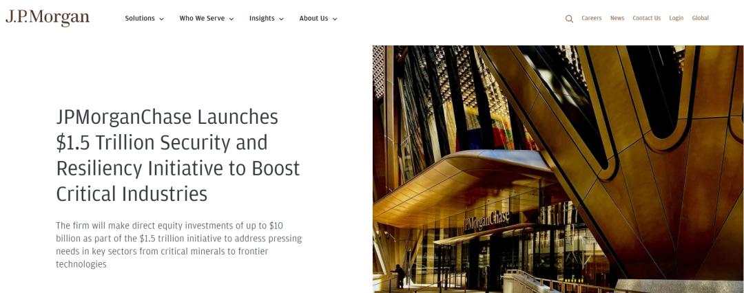 JPMorgan Chase 对外公布了一项十年期的 “安全与韧性计划”(Security and Resiliency Initiative),总规模一上来就给到 1.5 万亿美元。