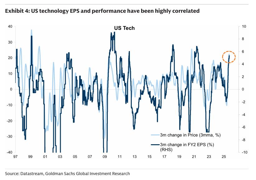 高盛通过将过去科技股的回报分解为盈利、估值和股利贡献后发现,2000年互联网泡沫峰值时,除了盈利之外,还有比我们今天所见的要大得多的估值上升。尤其是对于欧洲电信股来说,估值上升甚至更陡峭,回报几乎完全由估值而非盈利驱动。