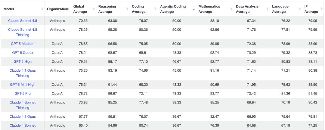 选择 Agentic Coding Average(智能体编程任务平均得分)后,模型排行榜,Claude Sonnet 4.5 位于第一名。来源: https://livebench.ai/
