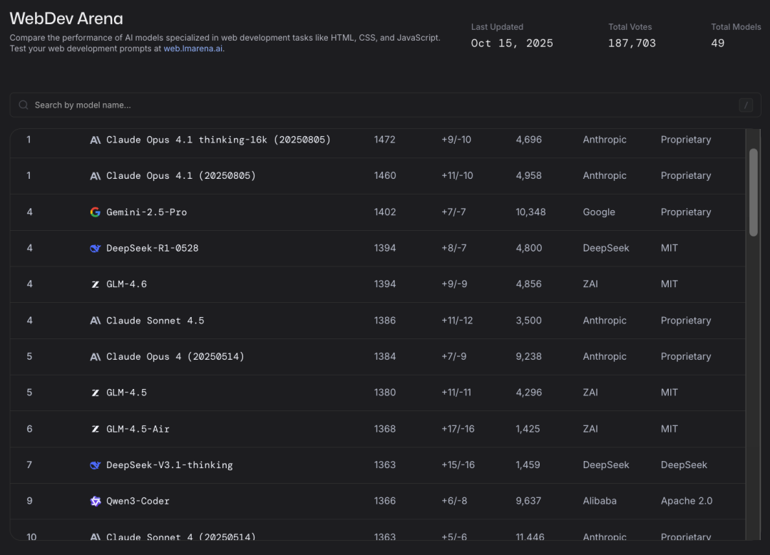 前端开发排行榜中,国产开源模型更是实现了跟编程 SOTA Claude 的分庭抗礼,DeepSeek-R1 / V3.1、GLM-4.6 和 Qwen3-Coder 都排到了前 10。