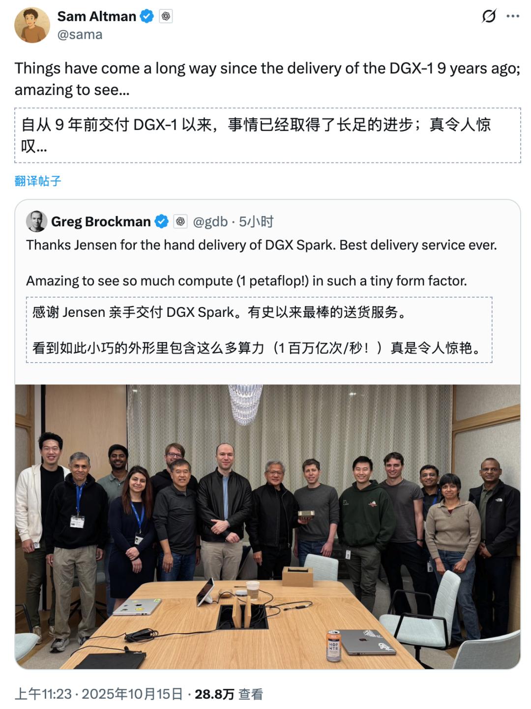 另外,黄仁勋最新的「掌心之中」AI超算DGX Spark开始交付了。
