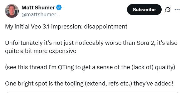 Otherside AI创始人Matt Shumer坦言"有些失望",认为其"效果明显逊于Sora 2,价格却高出不少"。但他也承认,谷歌在参考图像支持和场景延伸等工具链方面的优势值得肯定。