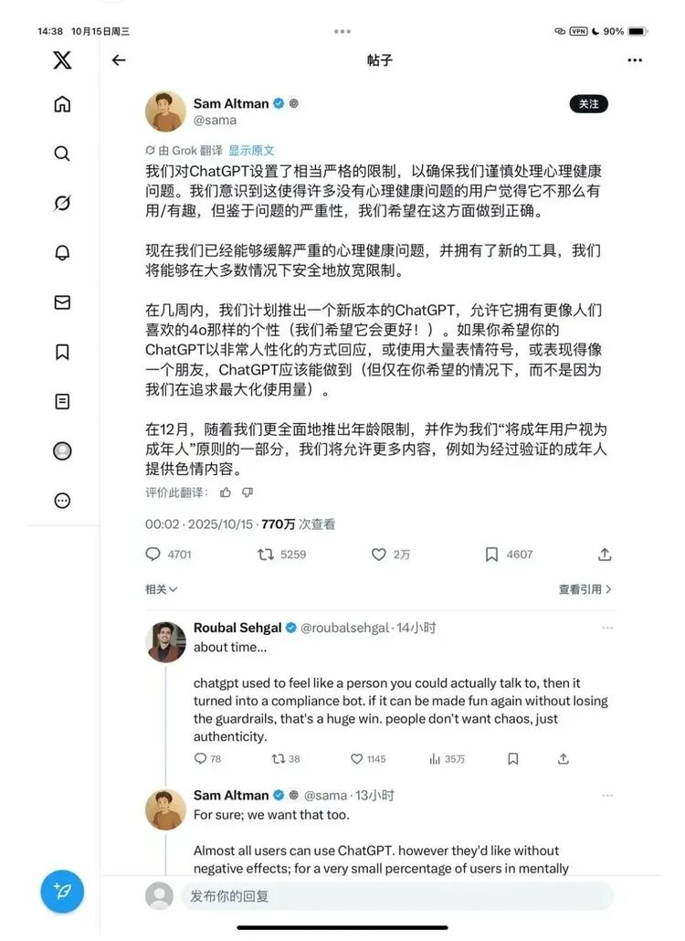 特别是在昨日,Sam Altman在X上再次回应了争议,称将推出成人模式,进行区分。