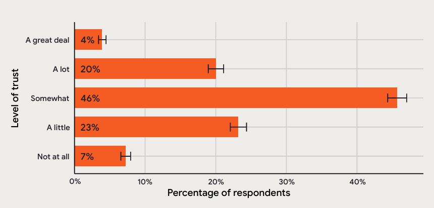 调查显示,虽然七成开发者对AI输出有一定程度的信心,但只有24%的人表示「高度信任」,其中仅4%「非常信任」,20%「比较信任」,仍有30%的人几乎不信任。