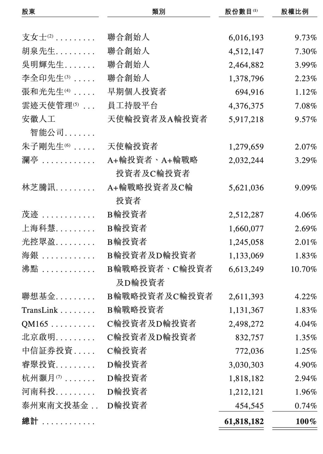 此外,沸点资本合计持股9.62%,系第一大外部股东;科大讯飞持股12.54%的安徽人工智能公司持股8.61%;林芝腾讯持股8.18%;启明创投旗下QM165持股3.64%,北京启明持股1.21%,合计持股约4.85%;联想基金持股3.80%;阿里旗下杭州灏月持股2.65%;早期个人投资者张和光持股1.01%。