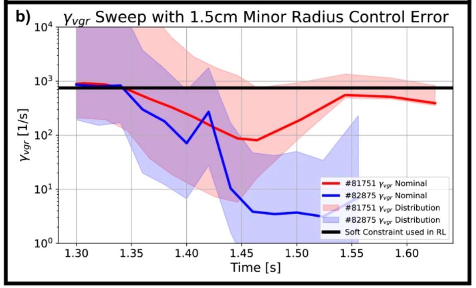 在所有实验中,最具启发意义的两个结果分别来自对「控制误差敏感性」的鲁棒性验证与「预测先行」外推测试。前者揭示了缓降阶段的一个脆弱点——当高场侧间隙出现微小偏差时,垂直不稳定增长率可能出现数量级放大,从而触发垂直位移事件(VDE)。