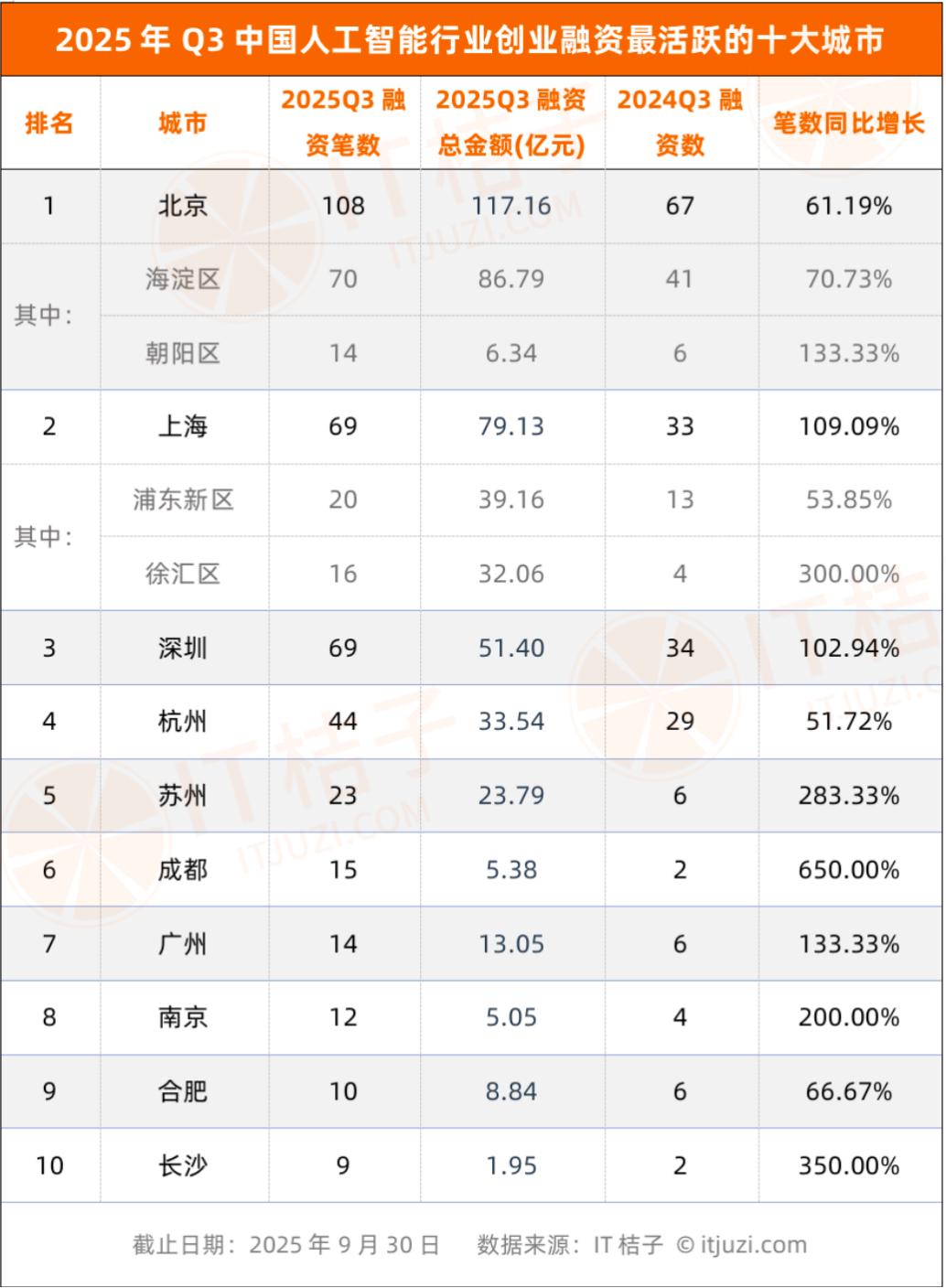 从城市的维度来看,今年三季度,哪些城市的人工智能产业发展受到投资人的青睐?