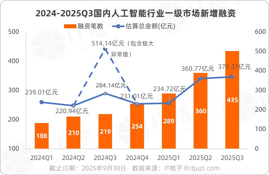 根据IT桔子数据,从2024Q1到2025Q3,国内AI行业的新增融资事件数实现了连续大幅跨越,从188笔至2025Q2基本实现翻番。2025Q3则达到了435笔,环比增长了20.8%,同比增长了99%。