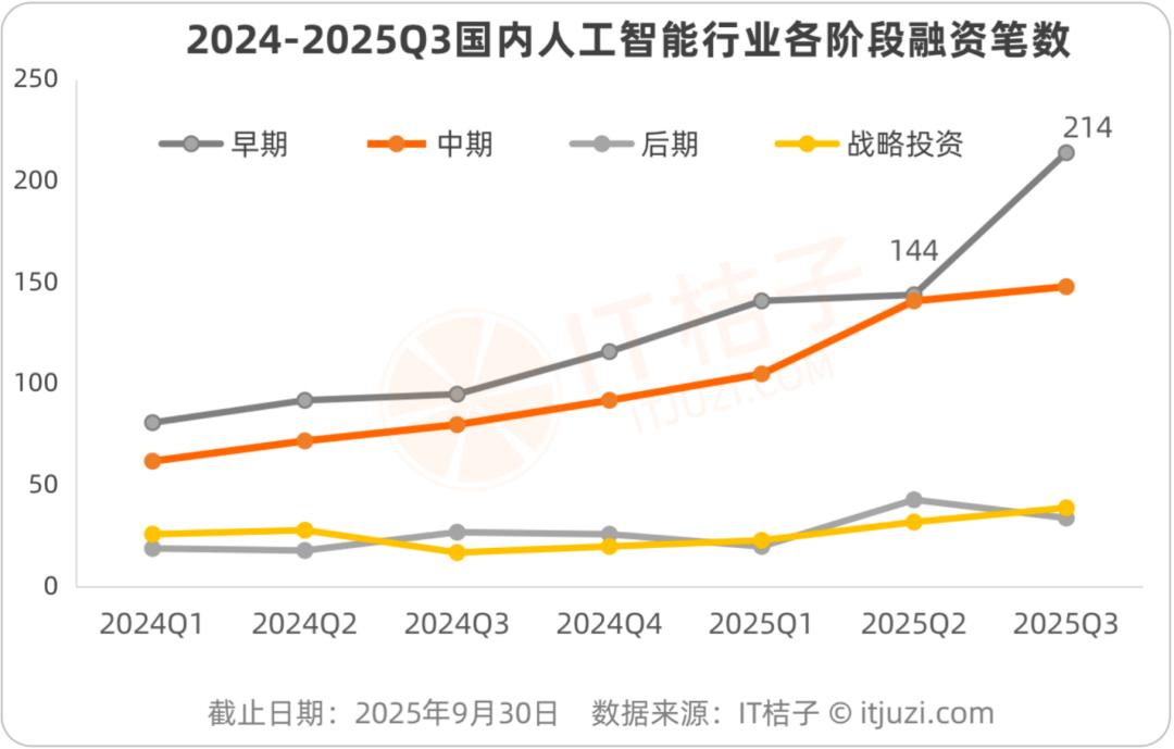 早期投资事件显著增长——从2025Q2的144笔增至214笔,增幅达到49%;而中后期投资基本停滞不前,甚至有所降低。由于早期投资单轮金额普遍较低,即便事件量激增,也难以拉动总金额大幅增长,因而导致了Q3季度整体融资金额仅微增。