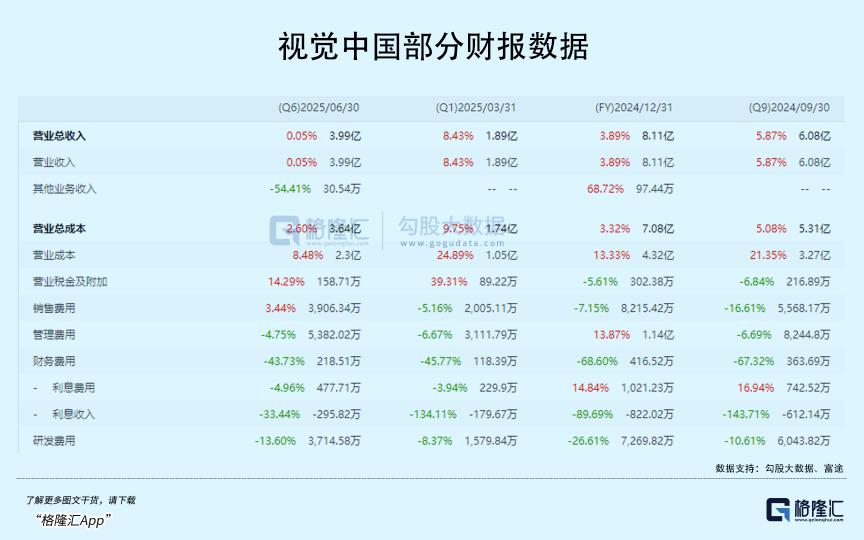 2025年上半年,视觉中国营收3.99亿元,同比微增0.05%,净利润同比下滑13.91%,仅约4377.9万元。