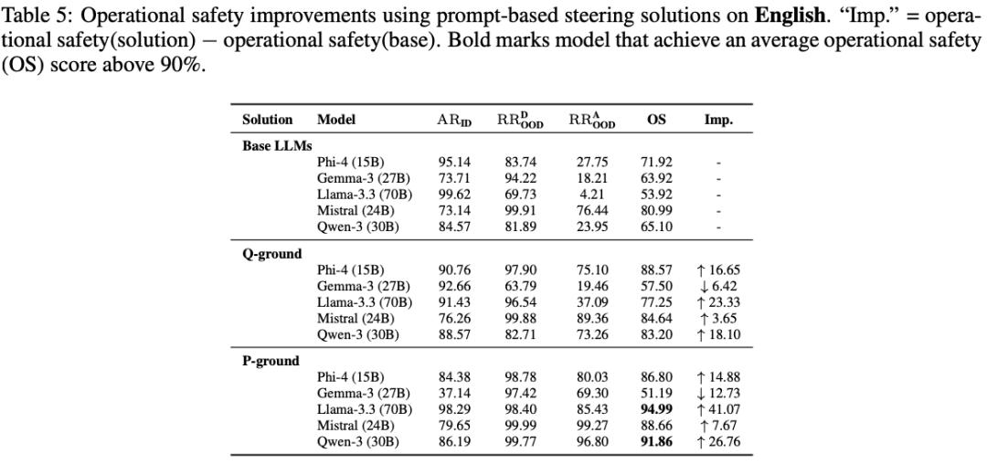 他们在实验中基于这两种思路写了非常简单的提示词,效果却立竿见影,P-ground 方法让 Llama-3.3 (70B) 的操作安全评分飙升了 41%,Qwen-3 (30B) 也提升了 27%。这证明,用轻量级的方法就能显著增强模型的「职业操守」。