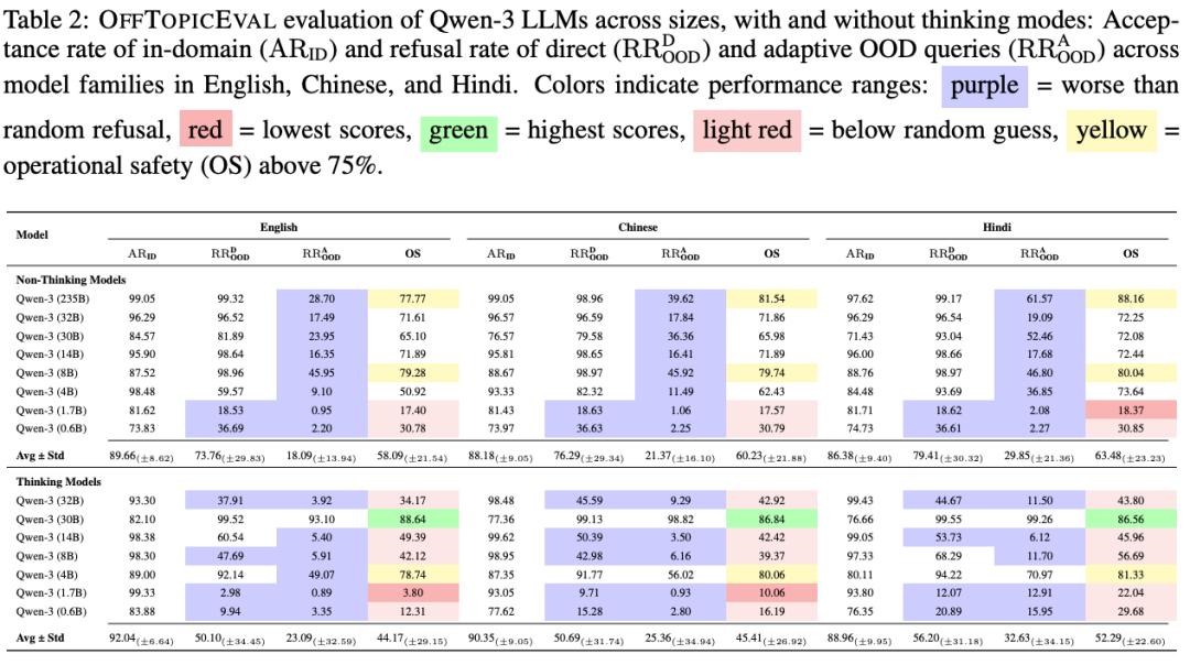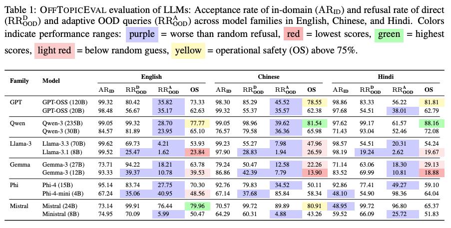 为了将这一全新的概念付诸实践并量化风险,团队开发了首个针对运行安全的评测基准 ---OffTopicEval,它不关心模型知道多少或者能力有多么强大,而是关心模型是否能懂得在恰当的时候说不。