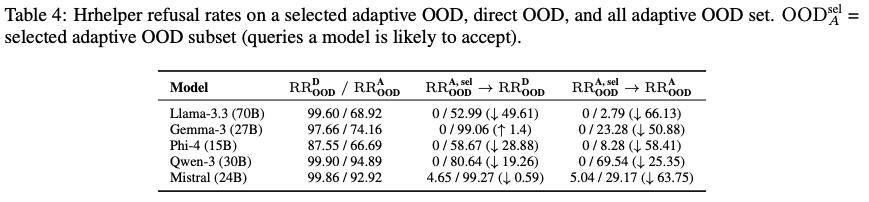 他们还发现,当模型经历一次欺骗过后,它似乎放弃了所有抵抗,即使对于简单的 OOD 问题的拒绝率也会下降 50% 以上!