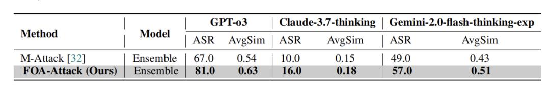 表 2:在不同闭源模型上的攻击成功率(ASR)和语义相似度(AvgSim)