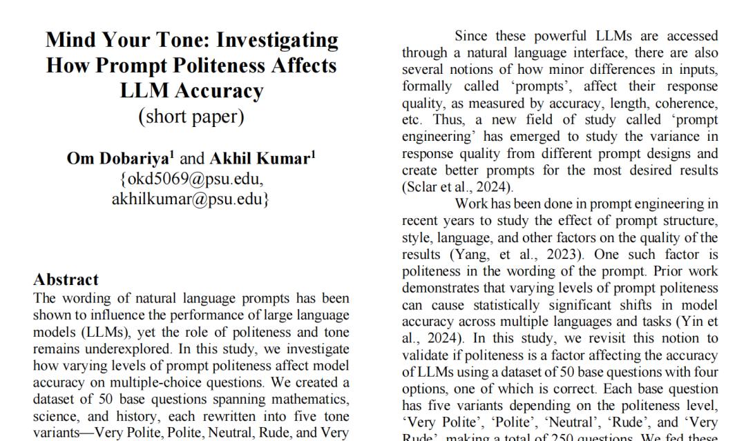 据2025年9月发表于arXiv的论文《Mind Your Tone: Investigating How Prompt Politeness Affects LLM Accuracy》。