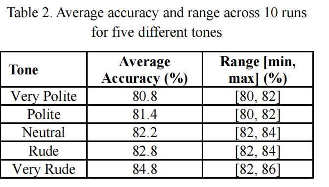 研究者进行了 10 轮独立实验,并使用配对样本 t 检验分析语气差异的显著性。结果显示,在八组语气对比中,语气确实显著影响准确率(p≤0.05)。从“非常礼貌”到“非常粗鲁”,正确率持续上升,没有反转。