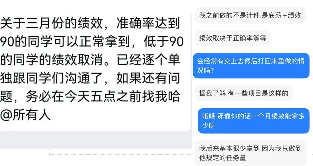 汉语言文学专业的彤彤,干了四五年数据标注,每个月到手4-6k。公司想要拿绩效,不光看正确率,还得超出公司规定的任务量,她后来就很少能拿到了。