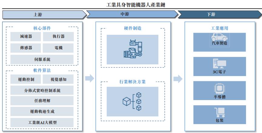 产业链方面,工业具身智能机器人行业上游为减速器、传感器、电机、伺服系统等核心零部件,以及运动控制、视觉感知、任务理解、工业级AI大模型等软件算法供应商,参与者包括英伟达、华为、寒武纪、绿的谐波、秦川机床、汇川技术、双环传动等。