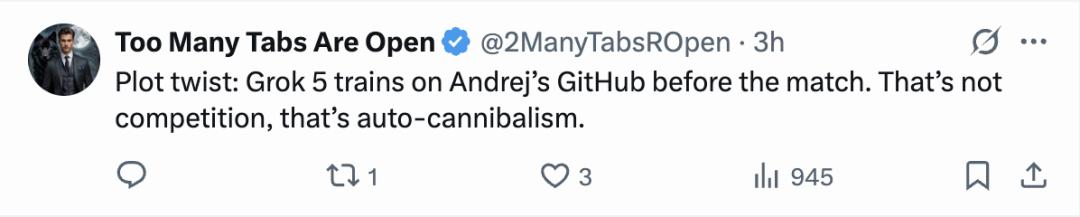 比如,Grok 5会跑到GitHub上拷贝卡帕西的代码然后打败他吗?
