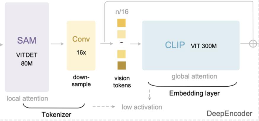 DeepEncoder会压缩图像打下,比如将输入大小为1024×1024的图像划分为1024/16×1024/16=4096个patch token。