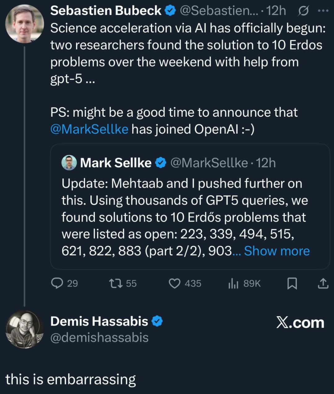 GPT-5一场闹剧,让OpenAI出大糗了!让所有人都以为GPT-5破解了十道Erdos难题,没想到竟是查文献给出了答案。Hassabis点评,这太尴尬了。
